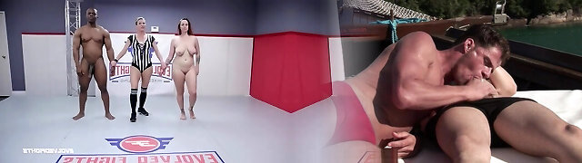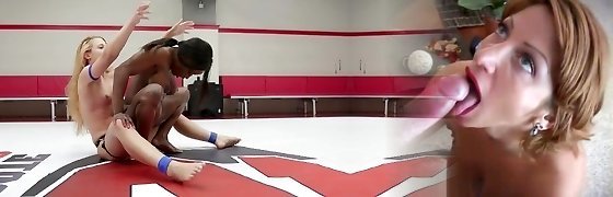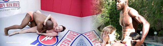 Two chicks grapple in a ring and get fucked by Black boy
