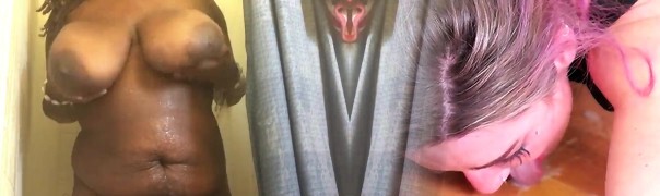 She deep throats her roommate'_s big dark-hued cock in the shower