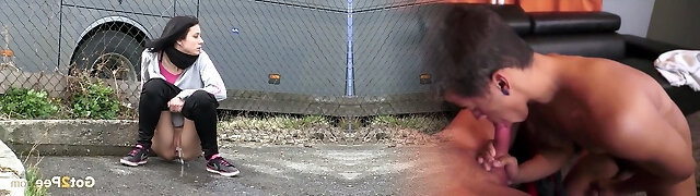 Straight haired emo chick pulls down dark-hued jeans to urinate at the bus parking